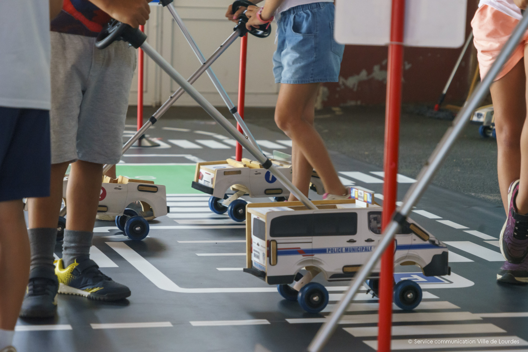 ● Sécurité routière avec « Buggy Brousse » : un circuit au sol reproduisant un centre-ville pour apprendre les règles de circulation, à pied comme au volant de petites voitures pédagogiques.