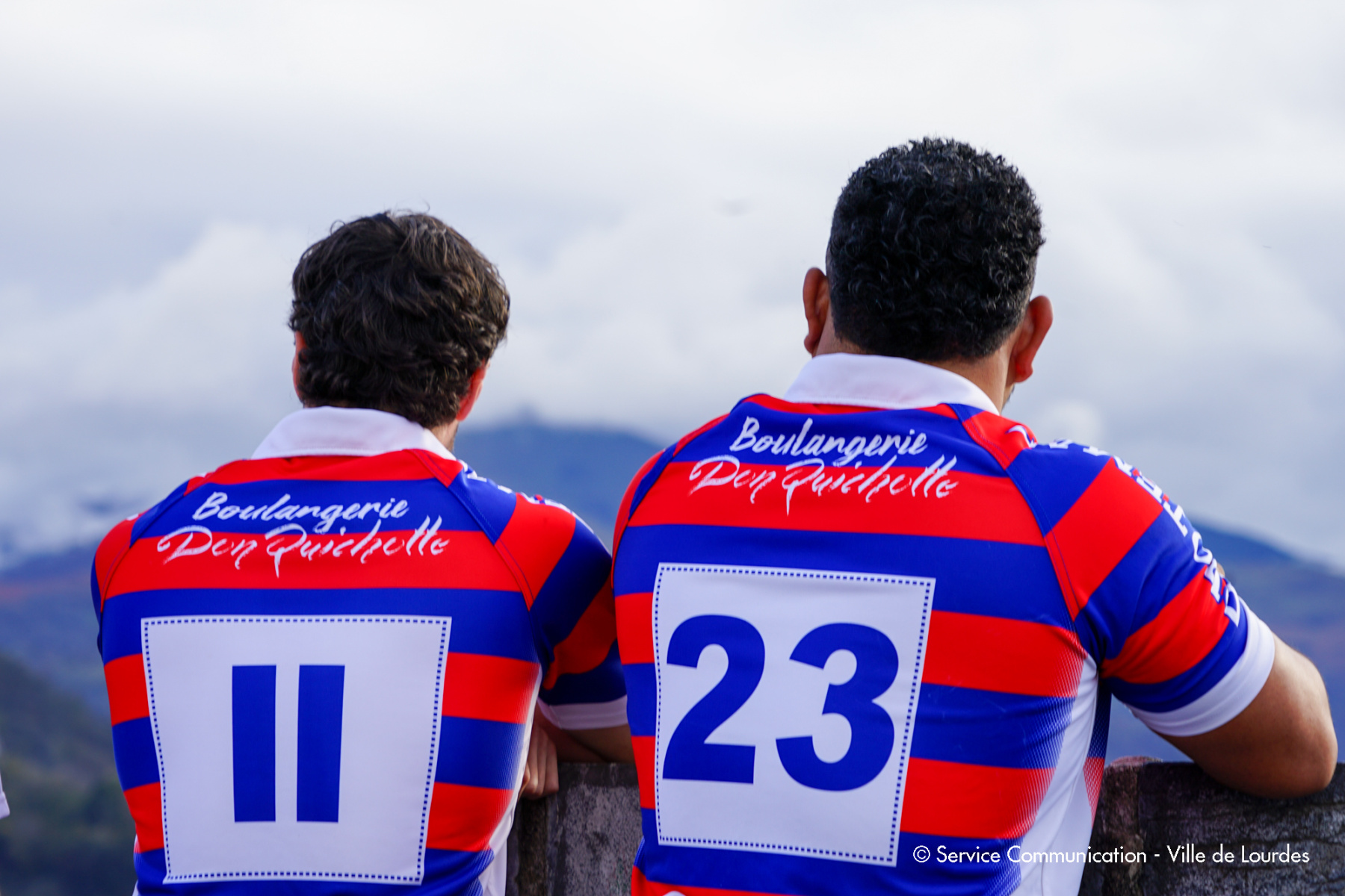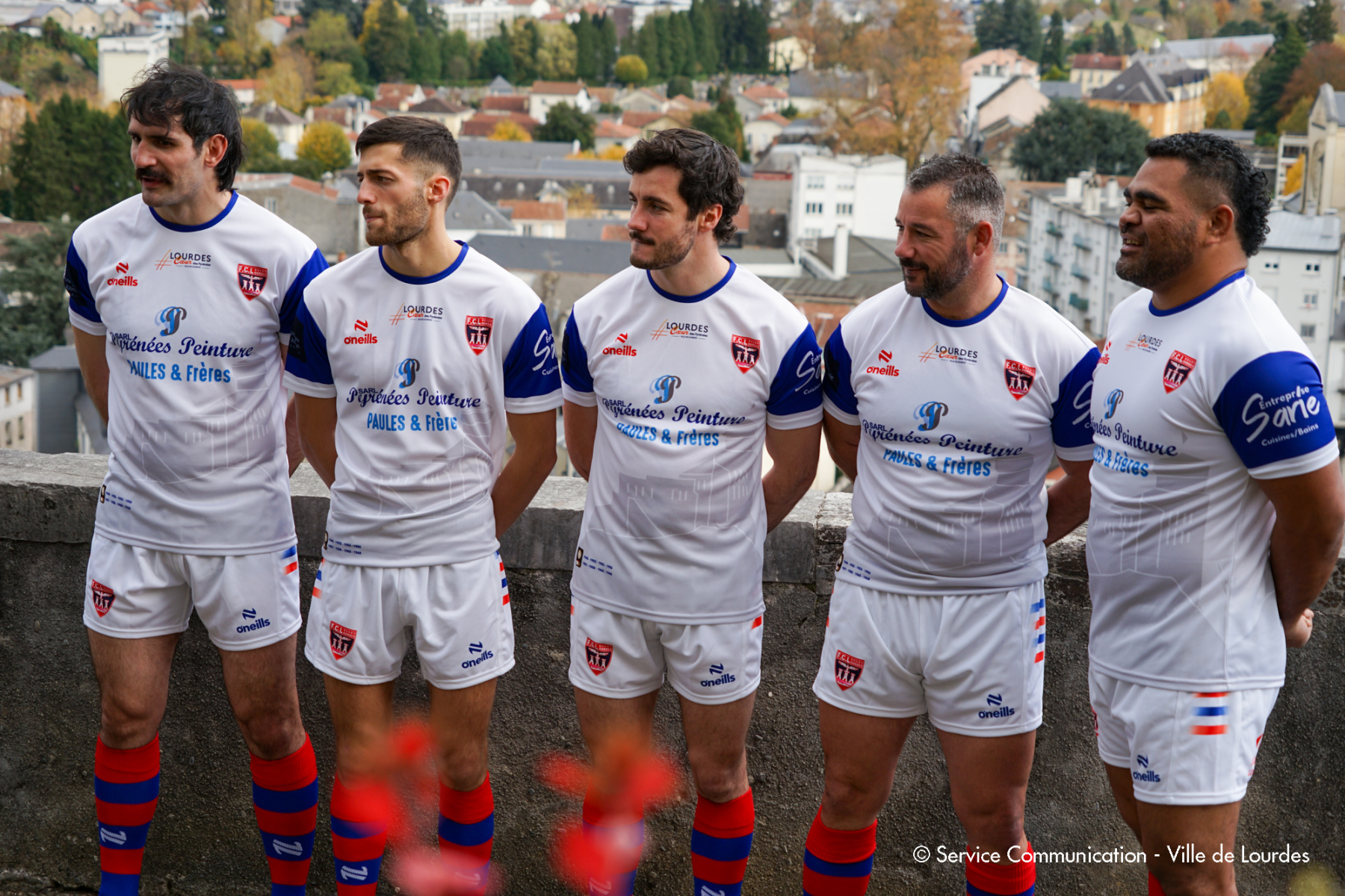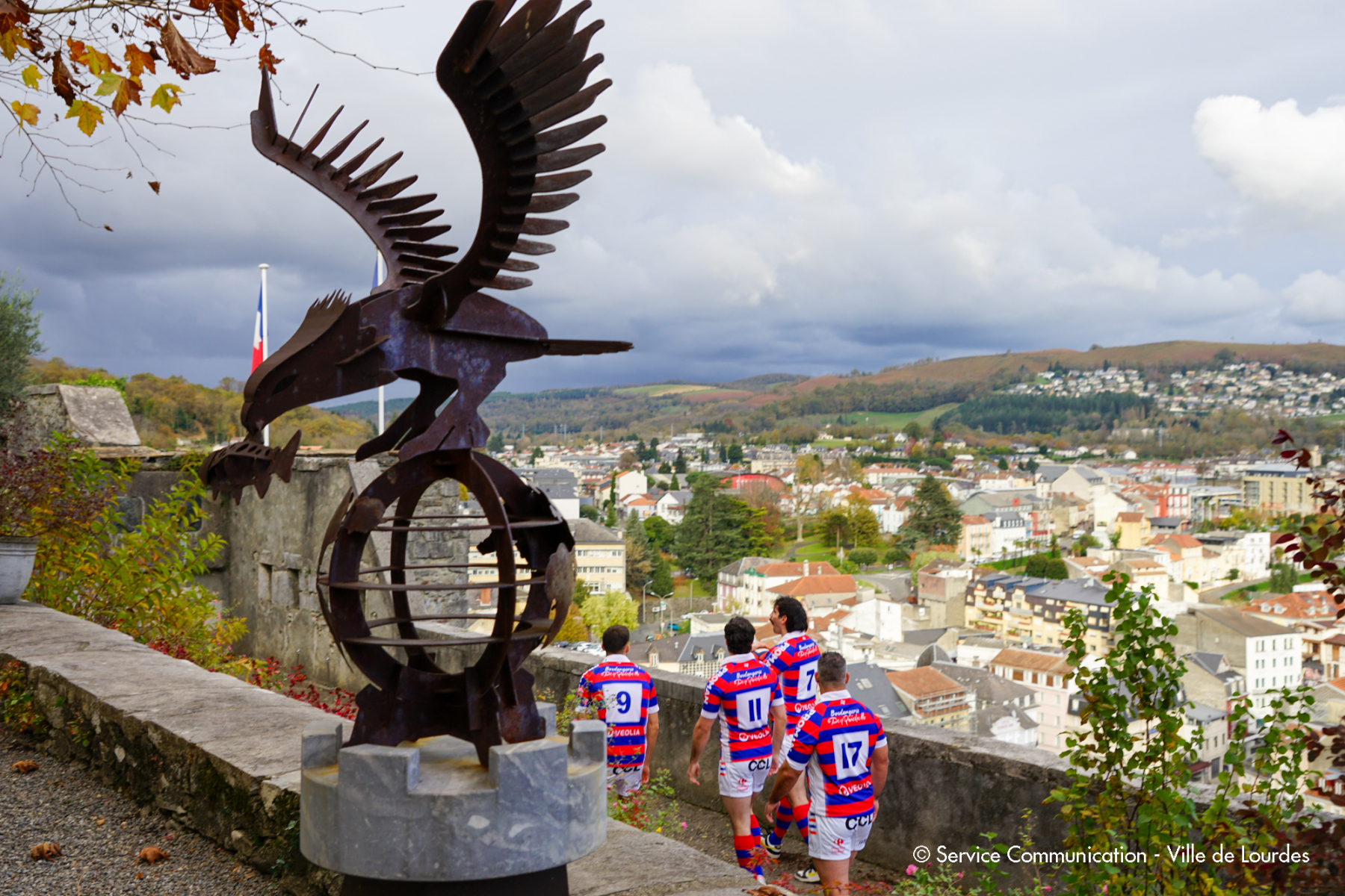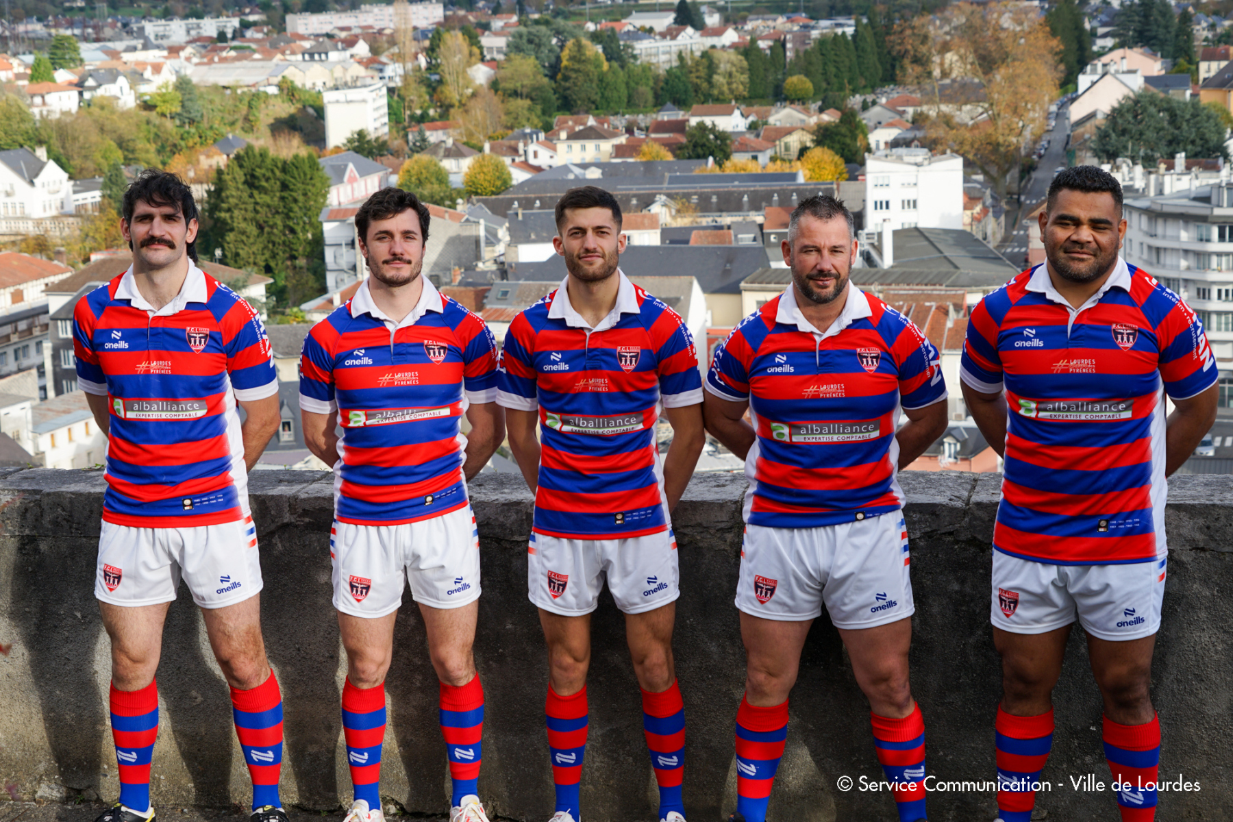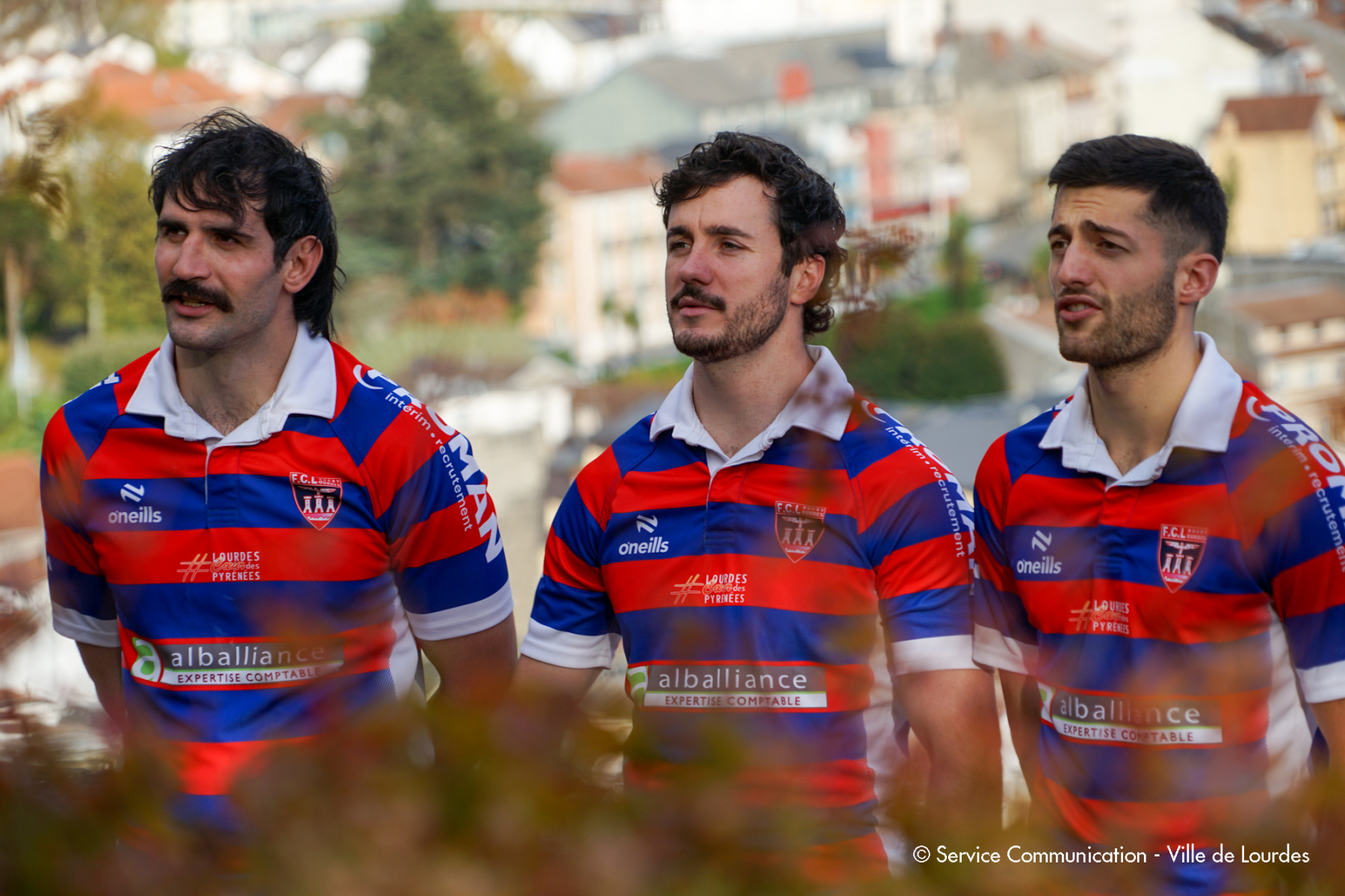 Lundi 17 novembre, les joueurs du FC Lourdes Rugby ont présenté leur tout nouveau maillot au Château fort – Musée pyrénéen : le maillot rayé aux traditionnelles couleurs rouge et bleu pour les matchs et le maillot blanc pour les entraînements.