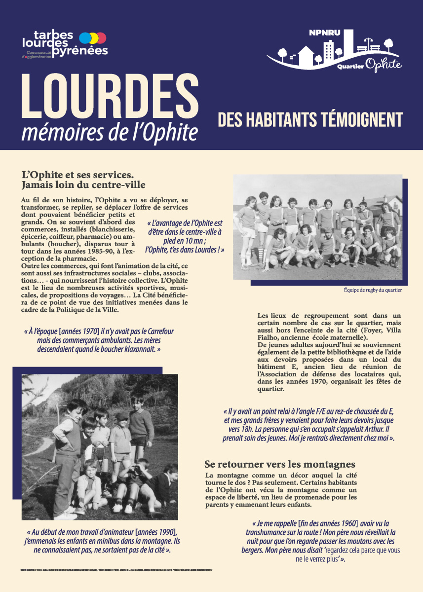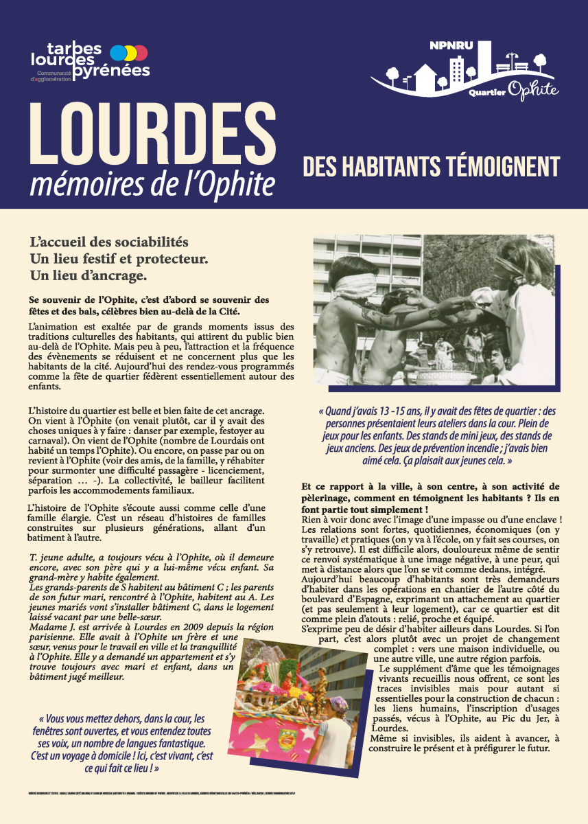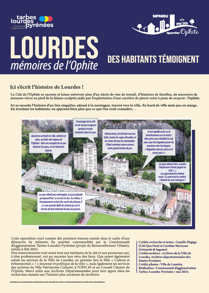 La réalisation de cette exposition liée à la reconnaissance et à la mise en valeur de la mémoire du quartier intervient dans le cadre du Nouveau Programme National de Renouvellement Urbain, le NPNRU de l’Ophite à Lourdes.
