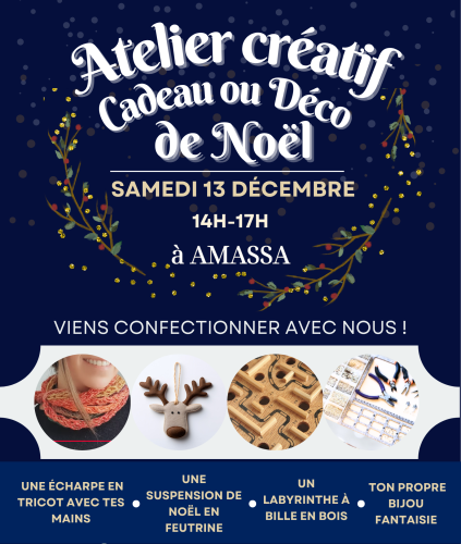 Atelier encadré par quatre artisanes : confection d’une écharpe en laine avec ses mains, d’une suspension en feutrine, d’un labyrinthe à bille en bois ou d’un bijou fantaisie.