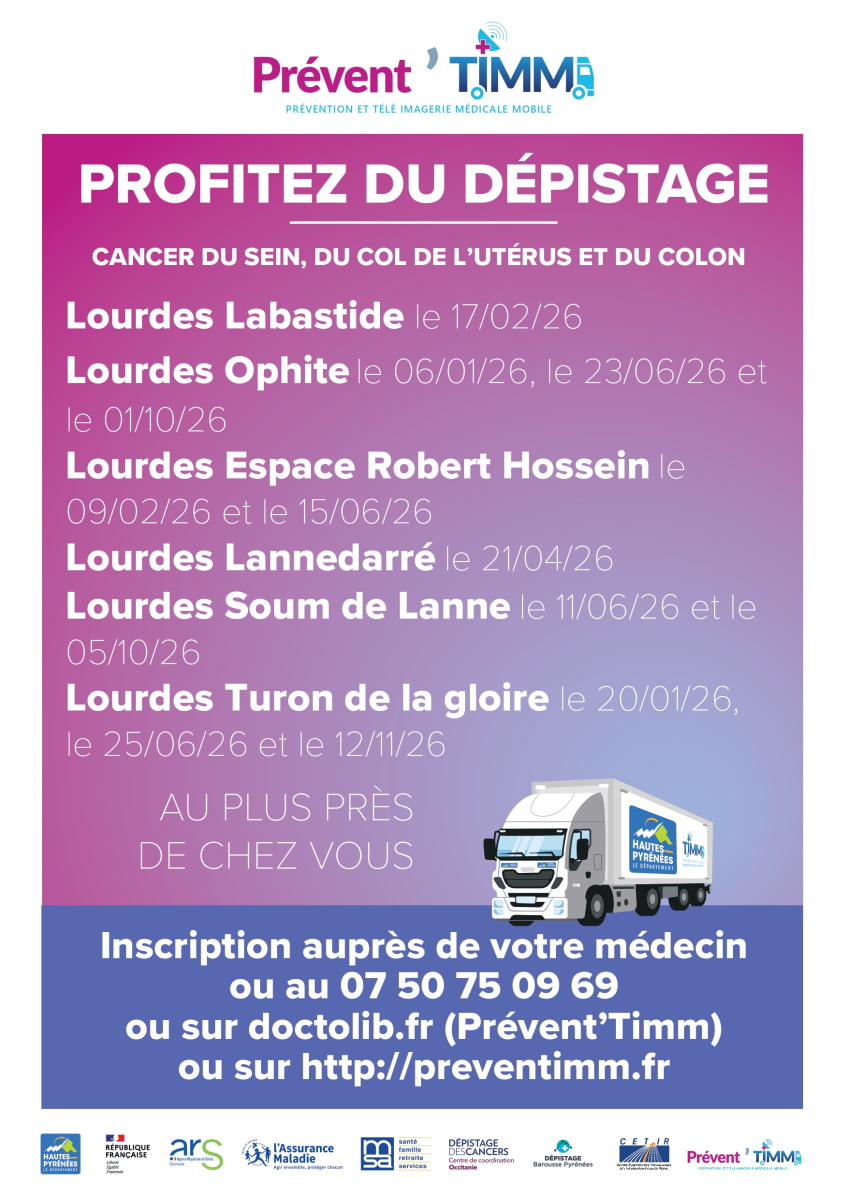 Le camion Prévent’TIMM est un dispositif dédié à la prévention santé et au dépistage organisé des cancers du sein, du col de l’utérus et du côlon. Il est piloté par le Département des Hautes-Pyrénées et l’ARS 65, en partenariat avec la CPAM, la MSA, la SELAS Dépistage Barousse Pyrénées, le CETIR ainsi que les professionnels de santé du territoire (médecins généralistes, sages-femmes, etc.).
