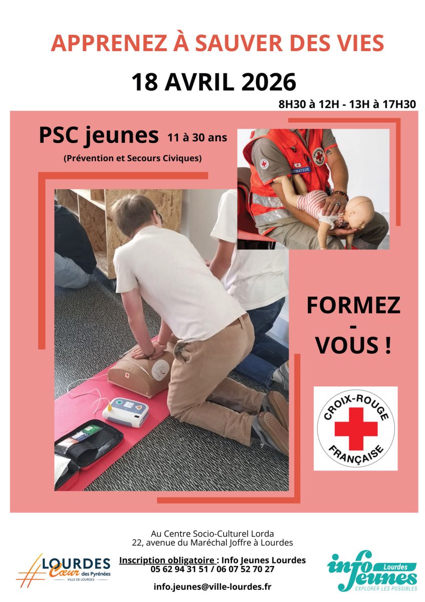 La Croix Rouge en partenariat avec l’Info Jeunes de la Ville de Lourdes te propose une formation PSC (Prévention et Secours Civiques) le samedi 18 avril 2026 de 8 h 30 à 12 h et de 13 h à 17 h 30 dans les locaux du Centre Socio-Culturel Lorda, 22 avenue du Maréchal Joffre à Lourdes.