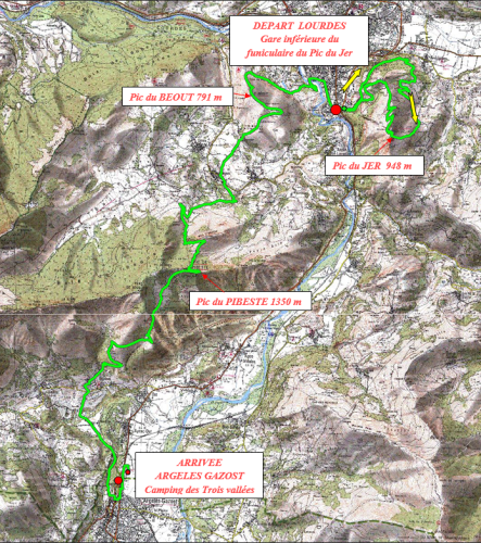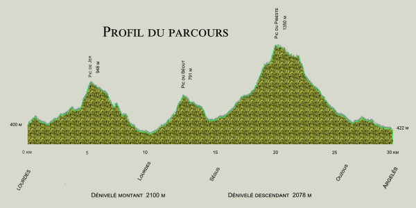 Sur une distance de 30 km, l’itinéraire mènera les coureurs du Pic du Jer (948 m), au sommet du Pibeste (1349 m) en passant par le Béout (791 m), avec un dénivelé positif de 2100 m et négatif de 2078 m.