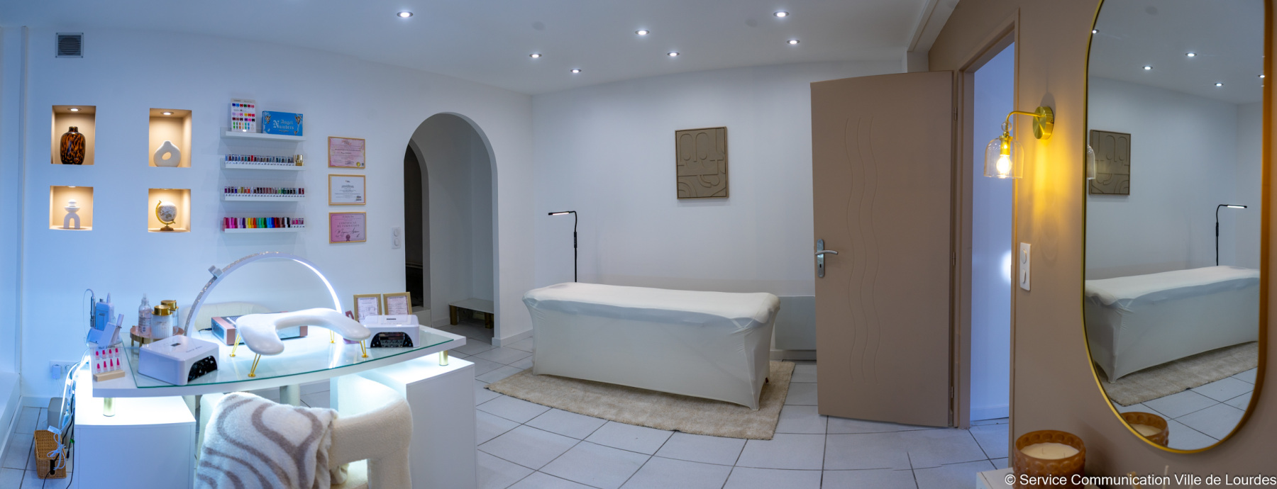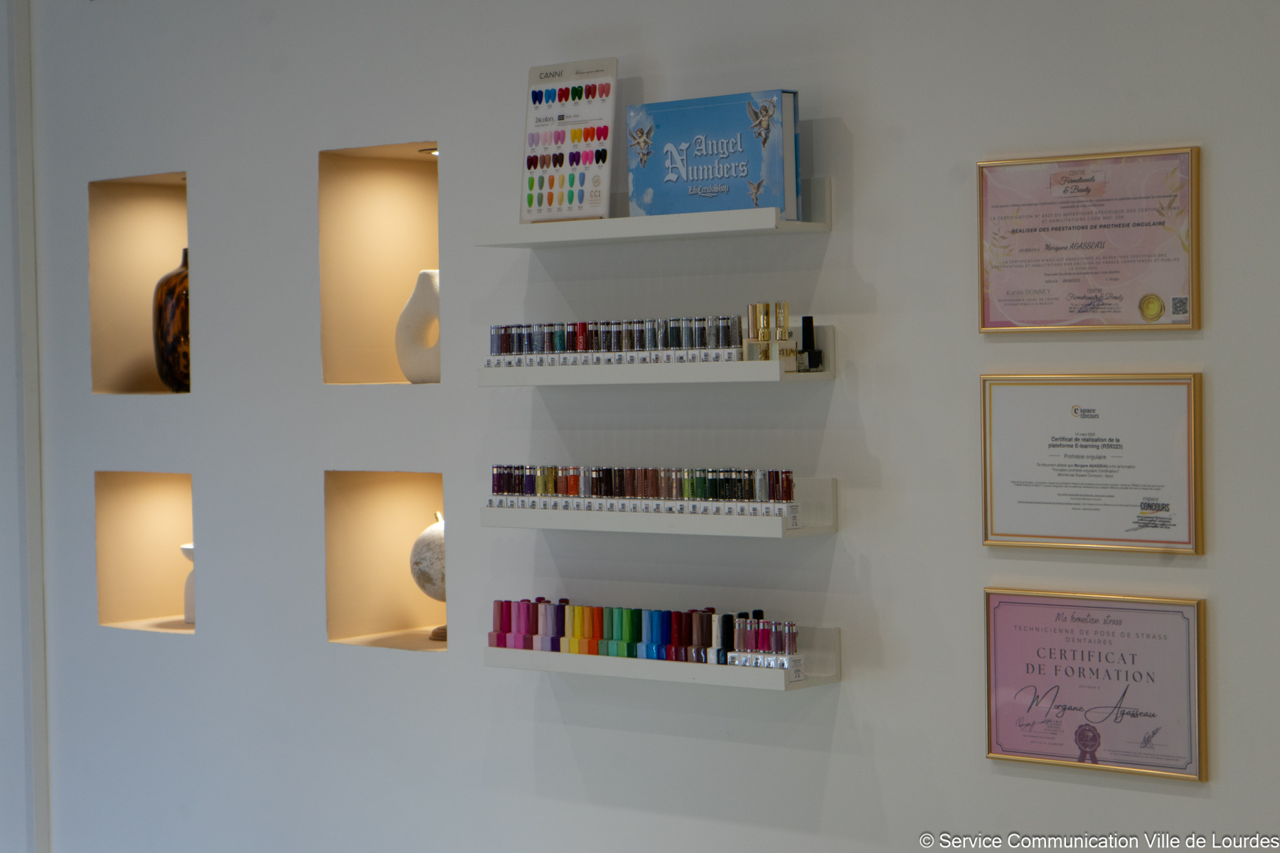 Pour cette première implantation en boutique, les deux associées ont entièrement rénové et décoré l’intérieur du local afin de créer une ambiance chaleureuse. L’espace se compose de deux salles de soins distinctes situées derrière le hall d’entrée : l’une dédiée aux soins ongulaires, l’autre aux soins des cils et sourcils. L’établissement dispose également d’un accès PMR par une entrée latérale donnant sur la ruelle, équipée d’une rampe facilitant l’accès aux différentes salles.