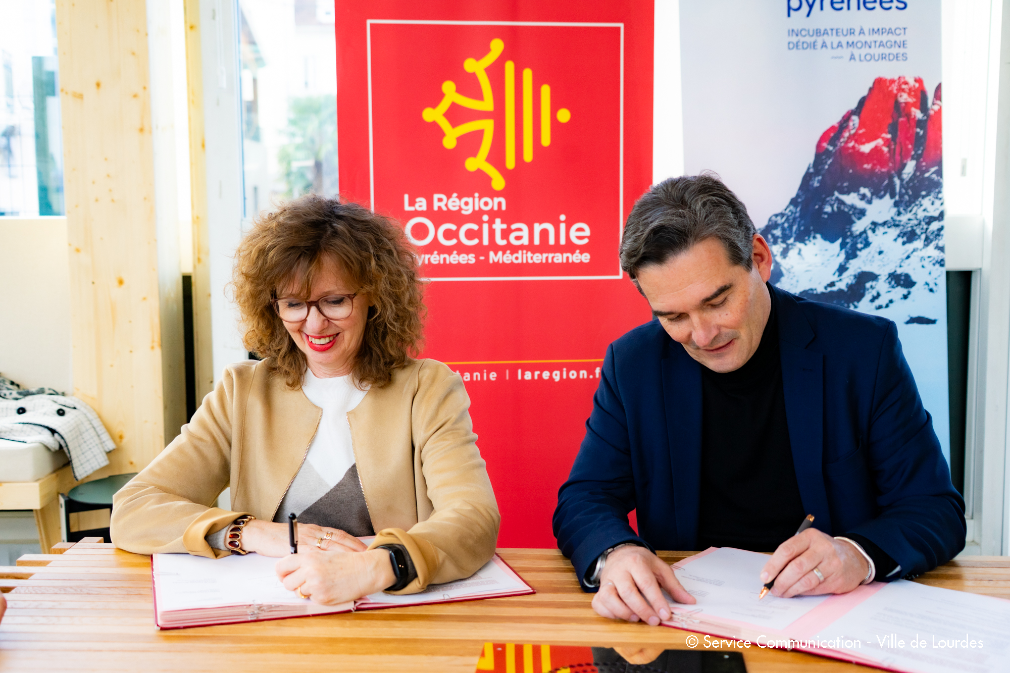 La vice-présidente au Tourisme de la Région Occitanie, Florence Brutus et Jean-Louis Cazaubon, vice-président régional, ont officialisé le renouvellement du label Grand Site Occitanie aux côtés du maire Thierry Lavit dans les locaux du tiers-lieu L’Altitude.