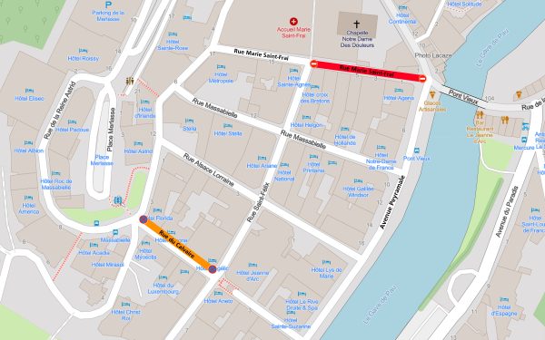 - Du vendredi 6 février 2026 à 8 h et jusqu’au dimanche 8 février à 16 h, la portion de la rue Marie Saint-Frai comprise entre son intersection avec la rue Saint-Félix et l’avenue Peyramale ainsi que les deux emplacements de stationnement situés à gauche de l’entrée principale de l’hôpital seront interdits à la circulation et au stationnement des véhicules autres que ceux liés à la retransmission de la messe du 8 février par France TV.