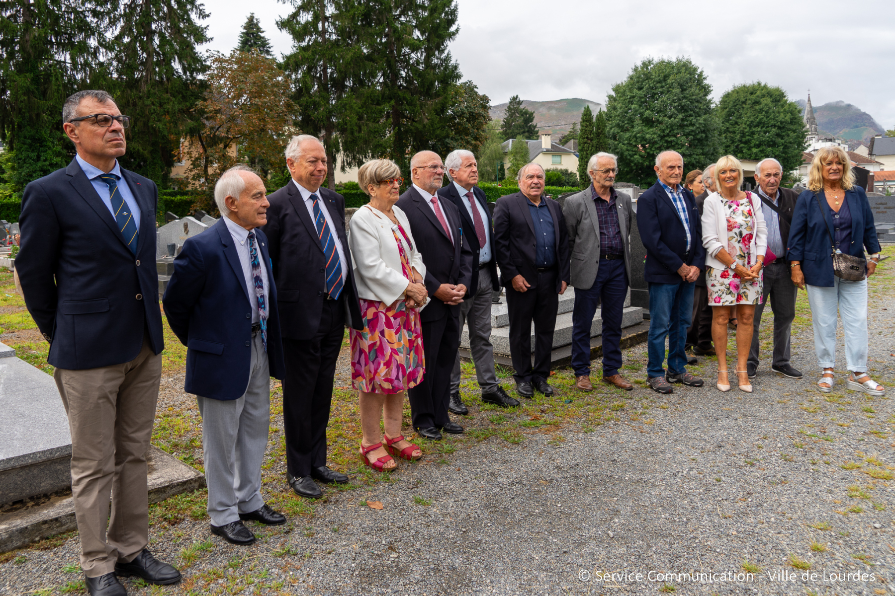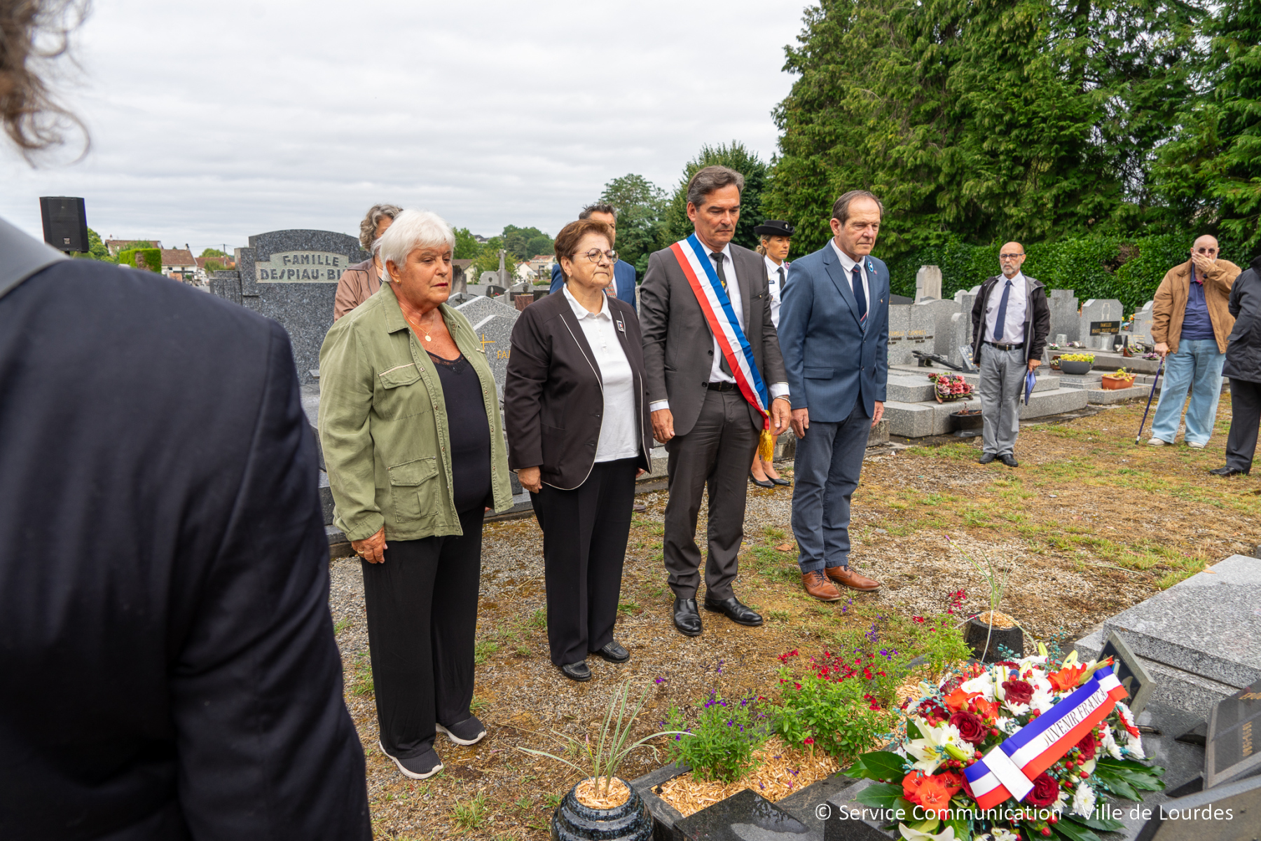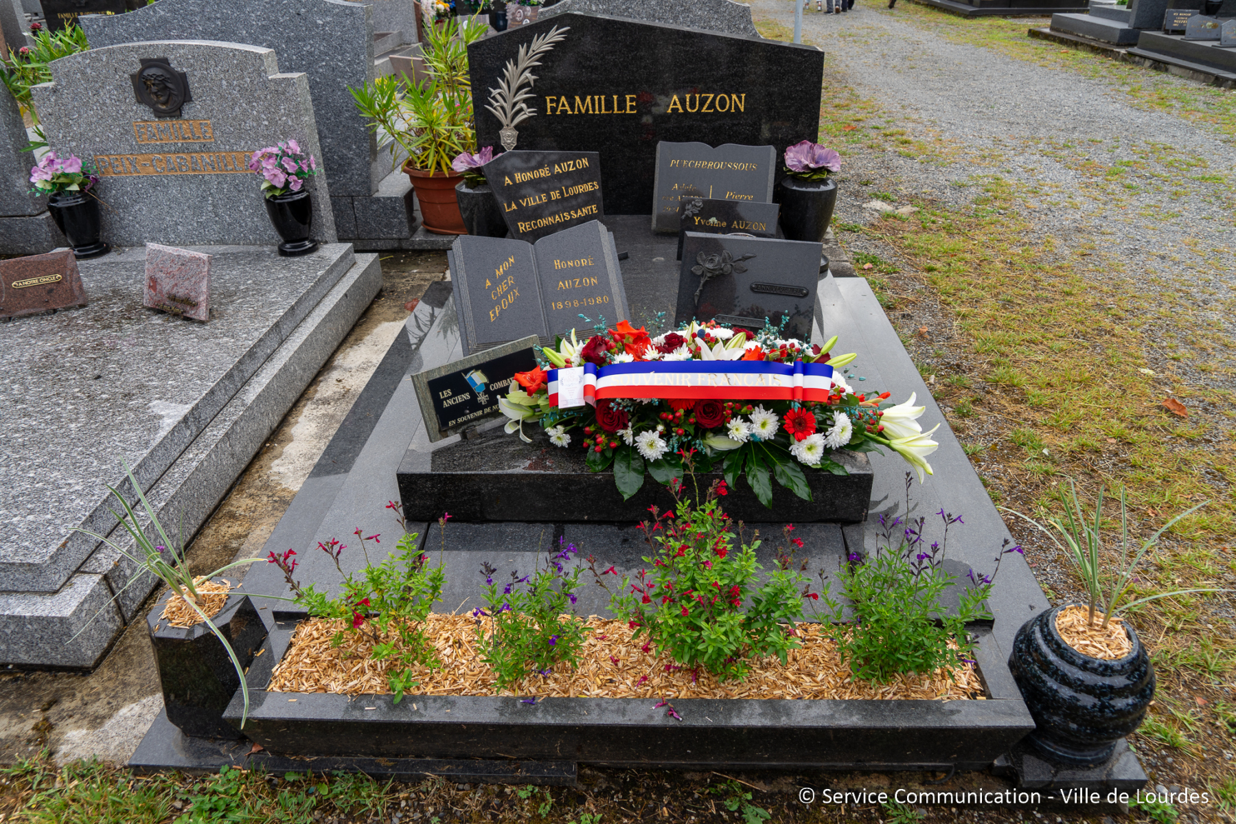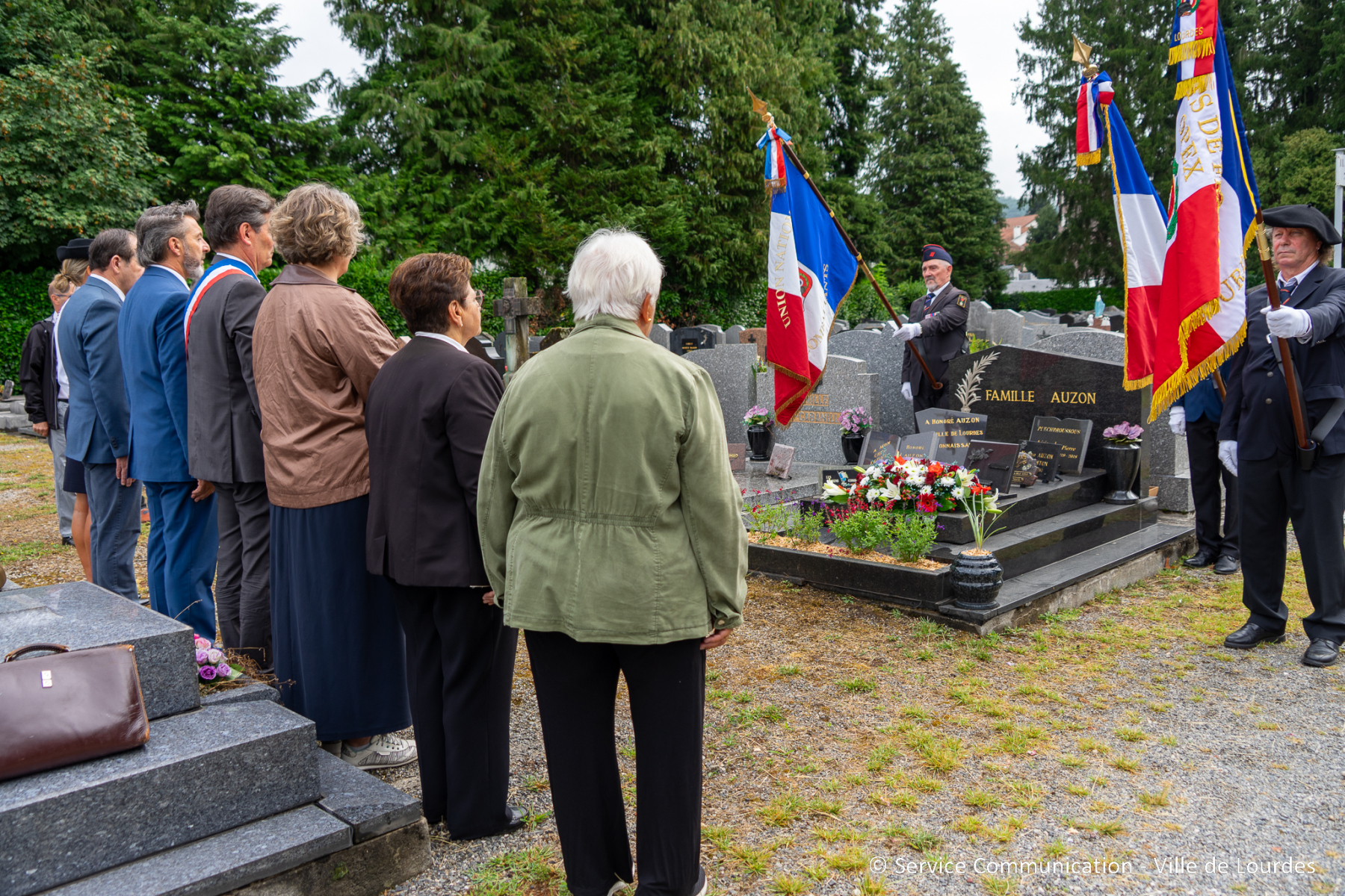 Ensuite, Thierry Lavit a invité l’assemblée à se diriger vers le cimetière de Langelle afin de rendre hommage au Capitaine Honoré Auzon et à tous les résistants lourdais où un dépôt de gerbe a été effectué par Madeleine Navarro présidente du Souvenir Français accompagnée de Thierry Lavit et Jean-George Crabarie.