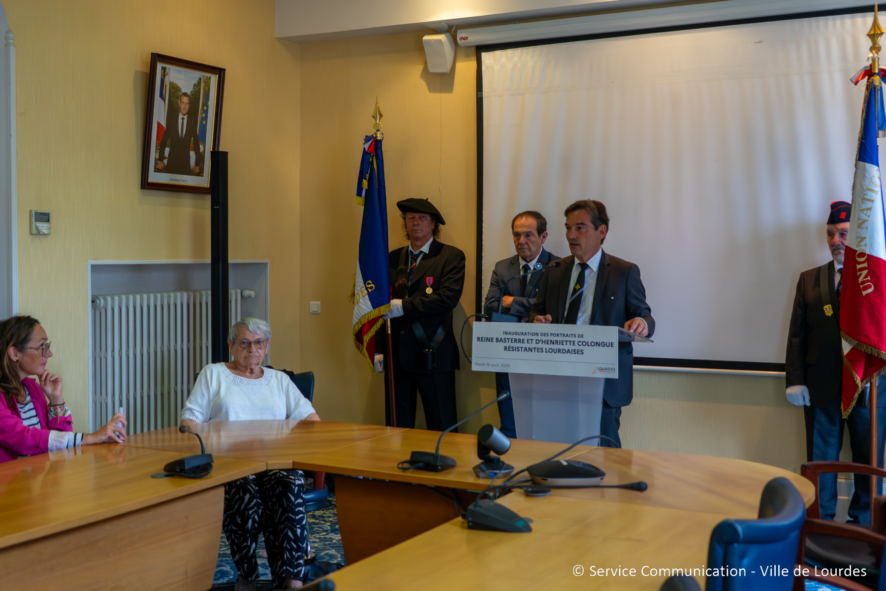 L’Histoire rend très souvent hommage aux hommes, à leurs actions de bravoure, d’héroïsme et de grandeur. Vous avez aussi remarqué qu’il est facile de trouver des renseignements sur les faits historiques de ces mêmes hommes. Tenter de rechercher et de trouver ces mêmes renseignements en ce qui concerne les femmes n’est pas chose facile. Dénombrer les bâtiments, les rues, les places qui portent leurs noms, s’avère une entreprise difficile.” Après avoir rappelé la biographie des deux résistantes mises à l’honneur, il a déclaré éprouver “une grande fierté à leur rendre hommage et les faire entrer dans la salle du Conseil municipal de la Ville de Lourdes, aux côtés de Mesdames Radegonde Callet et Alice Carrazé. Mesdames Reine Basterre et Henriette Collongue, la Ville de Lourdes souhaite vous donner la place, toute la place, que vous méritez. Mesdames Reine Basterre et Henriette Collongue, la Ville de Lourdes vous remercie sincèrement pour votre dévouement et votre courage pendant la Seconde Guerre mondiale. Mesdames Reine Basterre et Henriette Collongue, la Ville de Lourdes vous remercie au nom de toutes les Lourdaises et des Lourdais. Aujourd’hui, nous nous souvenons.”