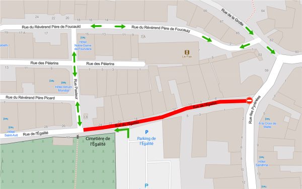 L’accès au parking de l’Égalité est maintenu. Les véhicules circulant rue de la Grotte et voulant se diriger vers le parking de l’Égalité se dirigeront vers la rue du Révérend Père de Foucauld, la rue Pasteur et la rue de l’Égalité.