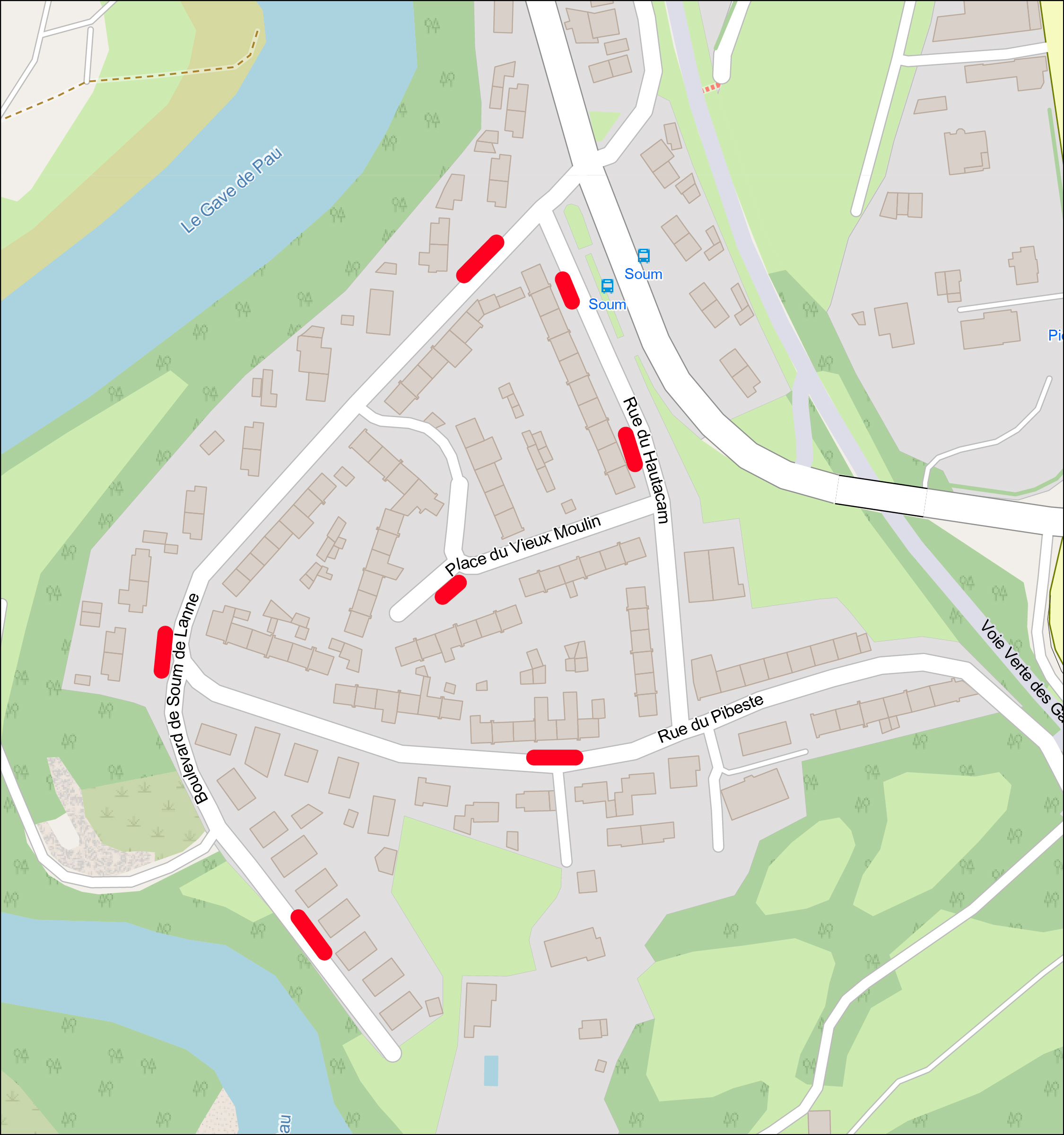 Durant la période indiquée, la chaussée est rétrécie boulevard de Soum de Lanne au droit des n° 10 et 32 et en face du n° 31, rue du Pibeste en face des n° 31 et 33, rue du Hautacam en face des n° 4 et 18, place du Vieux Moulin en face du n° 17, en fonction de l’avancement des travaux.