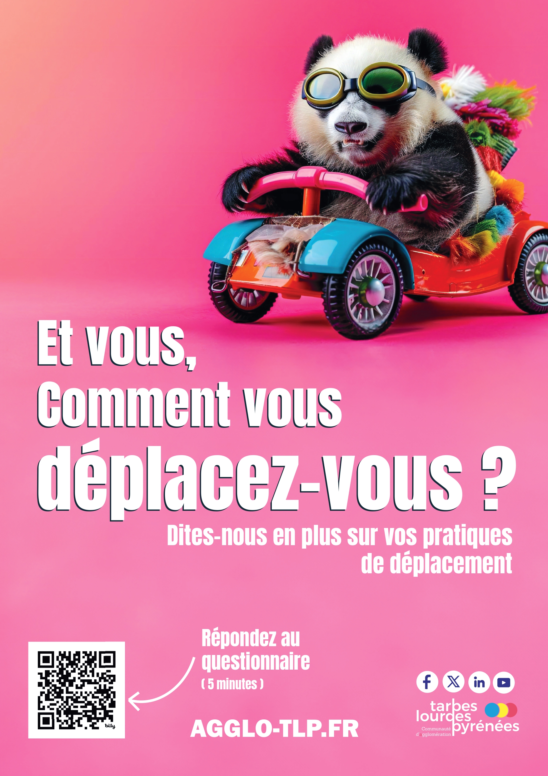 La mobilité occupe une place centrale dans la vie quotidienne, que ce soit pour aller au travail, accéder aux services, retrouver ses proches ou pratiquer ses loisirs. Pour répondre à cet enjeux la Communauté d’Agglomération Tarbes-Lourdes-Pyrénées travaille sur la réalisation d’un Plan de Mobilité Simplifié visant à améliorer les déplacements du quotidien pour toutes et tous. La CA TLP lance une enquête afin de mieux comprendre vos habitudes, vos besoins et vos attentes.